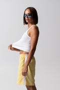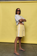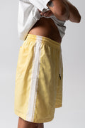 Relaxed mid shorts crafted from a lightweight summer sheen fabric. Designed with an elasticated drawstring waist and side lace detailing for a fun, feminine, elevated look. Easy, breathable, and perfect for warm days.