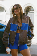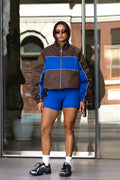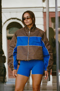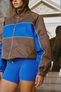 Crafted from a lightweight, breathable shell, this zip-through jacket features a rich chocolate base contrasted with bold cobalt panelling and subtle white piping for a clean, elevated finish. The high neckline and elasticated cuffs lock in warmth, while the roomy silhouette makes it perfect for layering over activewear or everyday basics.